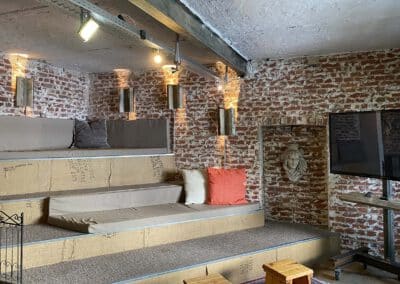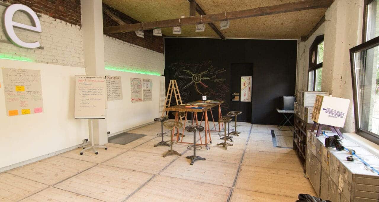 Ein 120 Jahre altes Gewerbeloft im Hinterhof erwartet dich und dein Team. 142m² auf 2 Etagen und 3 Raumbereichen. Oben 70m²: Kreativbereich – Unten 72m²: Präsentationsbereich & Lounge. Das Raumkonzept basiert auf jahrzehntelanger Erfahrung im Innovationsumfeld und neuesten neuro-wissenschaftlichen Erkenntnissen. Die einzigartige, kreative und inspirierende Atmosphäre wird ergänzt durch eine Workshop-Komplettausstattung.